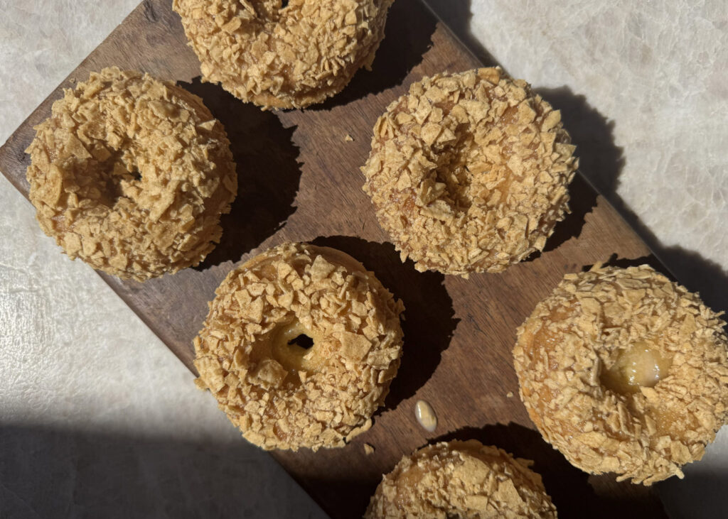 These donuts are baked and have a soft, cake-like texture…that pairs so perfectly with the sweet crunch of the crushed churro strips crust.